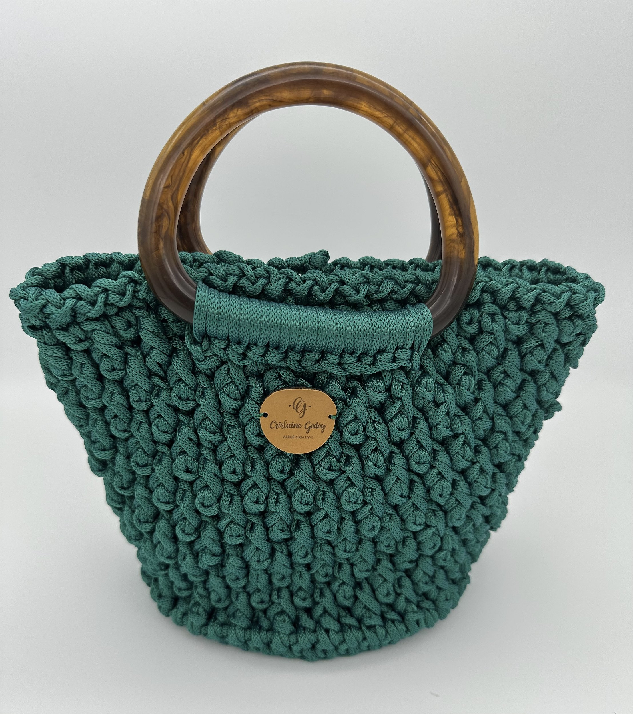 Bolsa confeccionada em crochê, em fio náutico, com alça de acrílico e botão de ímã, na cor verde.
