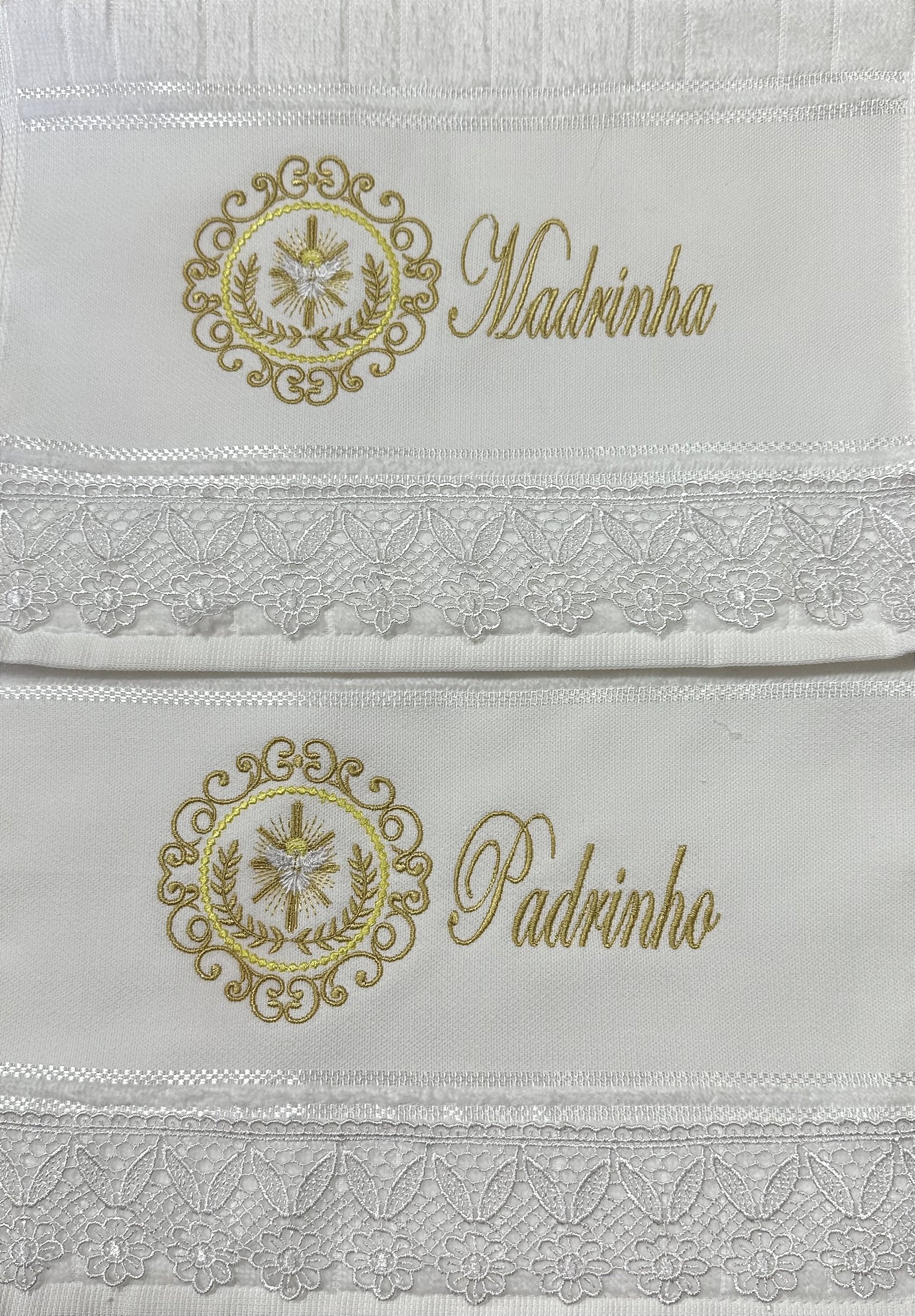 Jogo de toalhas de lavabo, com 2 toalhas (1 Madrinha e 1 Padrinho), da marca Dohler, medindo 30 x 45cm, bordada personalizada, com renda guipir.